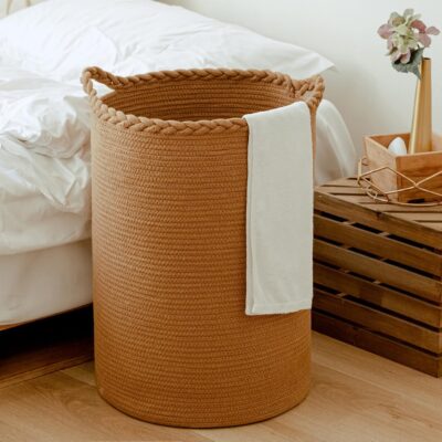 Homlikelan Woven Laundry Basket,Tall Wicker Laundry Basket for Blankets,Clothes,Pillows,Toys,Shoes Large Cotton Laundry Hamper for Bedroom Living Room Bathroom Nursery Brown