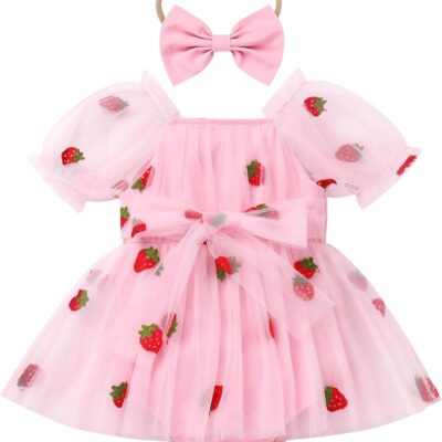 FYMNSI Newborn Infant Baby Girls Romper Dress Short Puff Sleeve Square Neck Tutu Tulle Princess Dresses with Bowknot Headband 2pcs Set