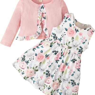 puseky Toddler Baby Girls Dress and Cardigan Set Baby Girl Floral Print Sleeveless Dress and Coat 2Pcs Outfits Set