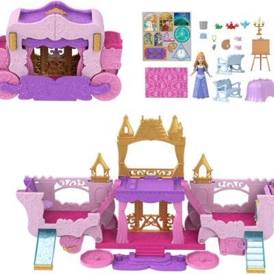 Mattel Disney Princess Carriage to Castle Transforming Playset with Aurora Small Doll, 3 Levels, 6 Play Areas, 4 Figures, Furniture & Accessories, HWX17