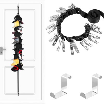 QUMENEY Adjustable Door Hat Display Rack Cap Holder Rack Organizer Over the Door Baseball Cap Organiser Hanging Cap Keeper with 20 Clip for Home Closet and Travel