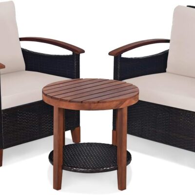 COSTWAY 3 Piece Rattan Bistro Set, Patio Sofa Set Garden Table and Chairs with Cushions, Outdoor Furniture Wicker Conservatory Set for Balcony, Backyard, Terrace and Poolside