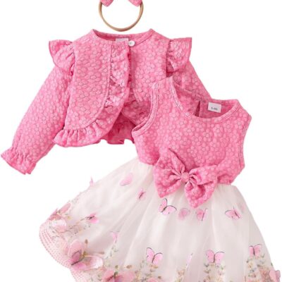 OMEWEE 3PCS Infant Girl Fall Outfits Floral Cardigan Butterfly Dress with Headband Long Sleeve Bolero Baby Girl First Birthday Outfit Photo Shoot Winter Casual Clothes