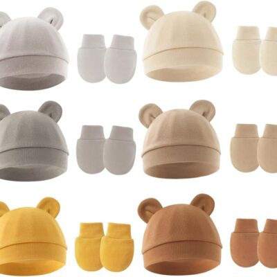 PythJooh Newborn Baby Hats and Mittens Set, Infant Baby Girl Boy 6 PCs Cotton Hospital Nursing Hats with 6 Pairs Anti-Scratch Mittens Set for 0-6Months