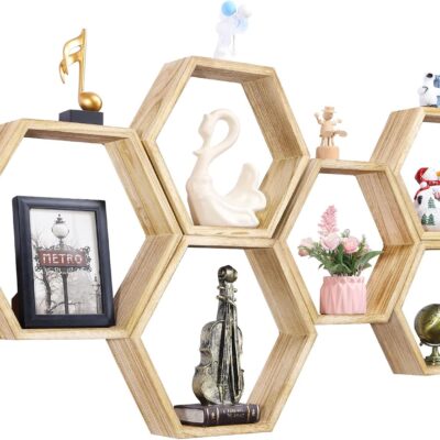 Hexagonal Floating Shelves Wall Mounted Set of 6 Wooden Hexagon Shelves Farmhouse Storage Honeycomb Wall Shelves Hexagon Hanging Shelves Rustic Geometric Wall Shelf for Nursery Bedroom Living Room