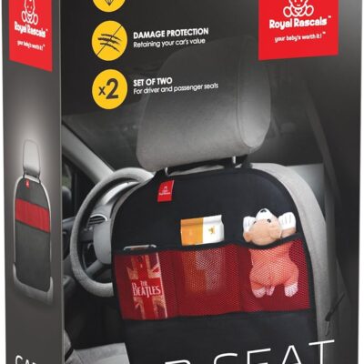 Royal Rascals Car Seat Kick Mats Back Seat Protector, Waterproof Upholstery Protection, Stain Resistant Seat Covers with Organiser Pockets & Storage, Baby Essentials, Set of 2 Car Accessories for Kids