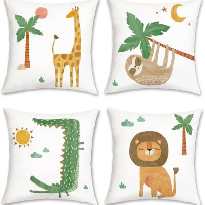Bonhause Jungle Animals Cushion Covers 45 x 45 cm Giraffe Lion Crocodile Sloth Decorative Throw Pillow Covers Soft Velvet Pillowcases for Kids Bed Baby Nursery Room Decor Set of 4