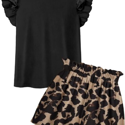 Arshiner Clothing Sets Girls Summer Solid Color T-Shirt with Shorts Outfit Children Cotton Ruffle Sleeve Clothing Set Leisure Fashion Two Piece Girl Clothes with Pocket 6-14 Years