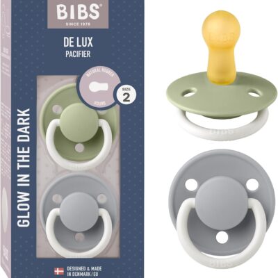 BIBS De Lux Soother 2-Pack, BPA Free Dummy Pacifier, Round Nipple. Natural Rubber Latex, Size 2 (6-18 Months), Sage Night/Cloud Night