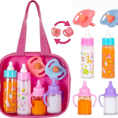 fash n kolor®, My Sweet Baby Disappearing Doll Feeding Set | Baby Care 6 Piece Doll Feeding Set for Toy Stroller | 2 Milk & Juice Bottles with 2 Toy Pacifier for Baby Doll Furniture