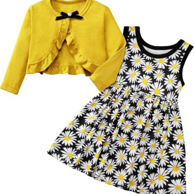 Naiyafly Baby Girl Dress With Cardigan Clothes Set Toddler Girls Long Sleeve Bow Button Cardigan + Sundress Suit Kids Knitted Cropped Sweaters Tops Dress 2 Piece Outfits 1-5 Years