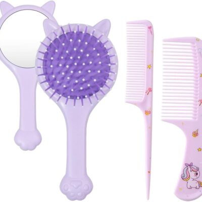 Bmeigo 3pcs Girls Hair Brush and Comb Set – Hair Detangling Brush with Mirror Wide Tooth Hair Styling Combs Detangler Baby Comb Set for Kids Curly Straight Long Hair, Purple Cute Cat