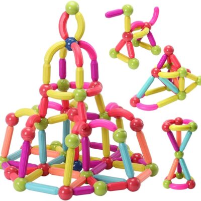 ROUSKY Magnetic Rods Set,Magnet Building Sticks Set, Building Blocks Tiles, STEM Stacking Toys for Kid Age 3+ (multicolour-128PCS)