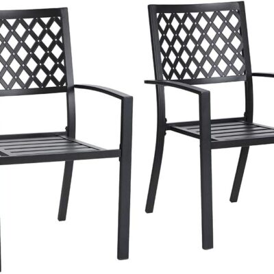 PHI VILLA Metal Garden Chairs Set of 2 Outdoor Patio Stackable Dining Chairs E-Coating Metal Frame Garden Dining Chairs With Armrests Black Weather Resistant 2 Pack