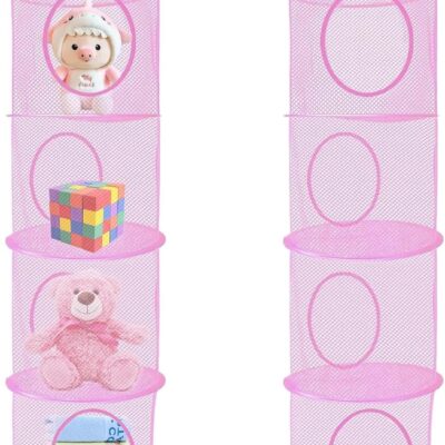 Hanging Mesh Storage Basket, 2 PCS Foldable 4 Tier Compartment Hanging Teddy Storage Net Save Space Organizer Small Toy Storage Box for Soft Toys Clothes Sundries (Pink)