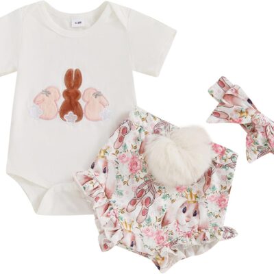 Dubute My First Easter Outfit Baby Girl Bunny Romper Bodysuit +Pompom Shorts Bloomer 1st Easter Clothes 3PCS