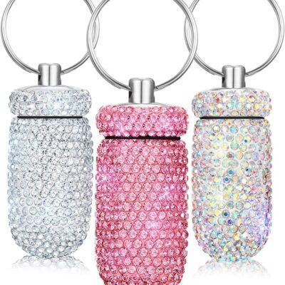 3Pcs Blingbling Crystals Waterproof Pill Organizer Case Container Storage Box Pocket Keychain Portable Aluminium Alloy Holderfor Medicine Vitamins Outdoor Camping Travel Dispenser