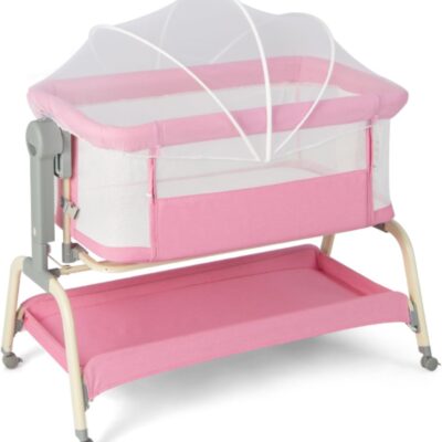 Maxmass 4-in-1 Baby Crib, Height Adjustable Infant Co-Sleeper Travel Cot with Detachable Net, Lockable Wheels, Storage Basket and Carrying Bag, Newborn Cradle Bed for 0-6 Months Old (Pink)