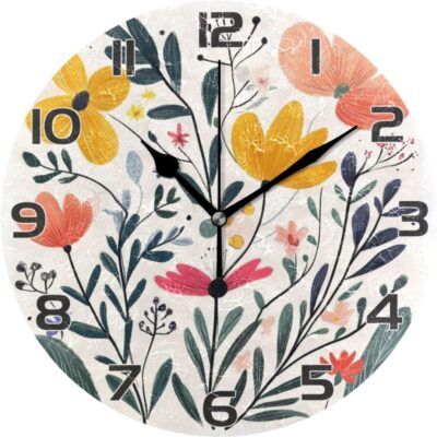 Ewusp Watercolor Flower Wall Clock Battery Operated Silent Non-Ticking Clock Round Quartz Decorative Clock for Kitchen Living Room Bedroom Office School Nursery, 25×25 cm