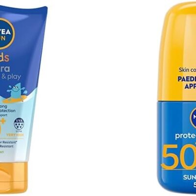 NIVEA SUN Kids Swim & Play // Ultra Protect & Play SPF 50+ Lotion (150ml), Water-Resistant Sunscreen & SUN Kids Protect & Care Caring Roll-On (50 ml) Sunscreen with SPF 50, Roll-On Kids Suncream