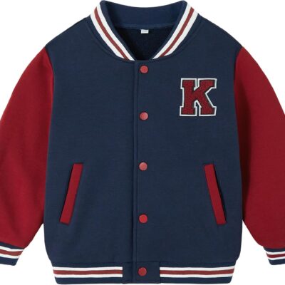 Volunboy Toddler Boys Varsity Baseball Jacket, Button Down School Coat Stand Collar Letter R J Patch Outwear With Pocket