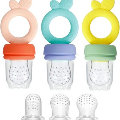 PandaEar Silicone Baby Fruit Feeder Pacifier| Baby Food Dummy Feeder| Teething Weaning Dummies Fruit Teether| 3 Pack Fruit Dummy for Babies 6-12 Months with 3 Sizes Silicone Pouches, BPA Free