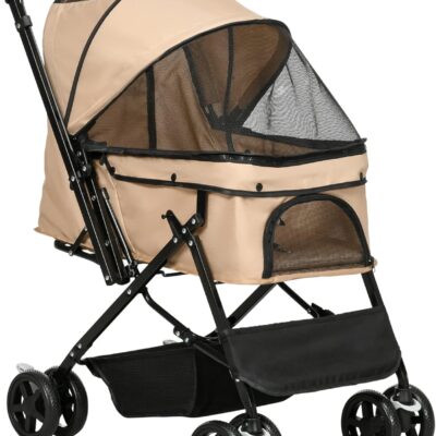 PawHut Dog Stroller, Pet Stroller, Foldable Dog Cat Travel Pushchair with Reversible Handle, EVA Wheels, Brake, Basket, Adjustable Canopy, Safety Leash, for Small Dogs, Light Brown