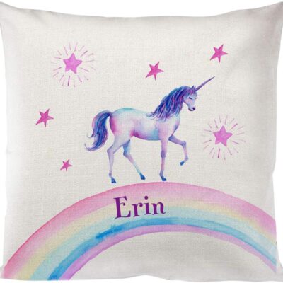 Artylicious Personalised Unicorn cushion, Children”s name magical rainbow, customised nursery girls Linen cushion/pillow’