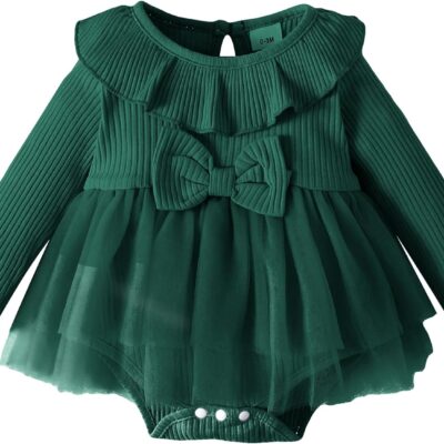 Infant Toddler Baby Girls Ribbed Romper Dress Long Sleeve Autumn Winter Bodysuit Tutu Princess Bowknot Ruffle Tulle Dress Birthday Photo Shoot Party Dress