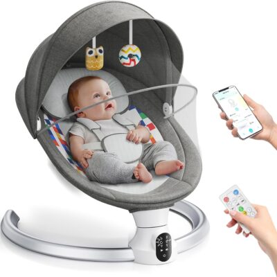 Ixdregan Electric Baby Bouncer, Baby Swing Chair with 5 Swing Speed, Electric Baby Swing with Remote Control Blueteeth Music Timer,10 Music,Portable Newborn Rocking Chair,2 Toys, (Gray)