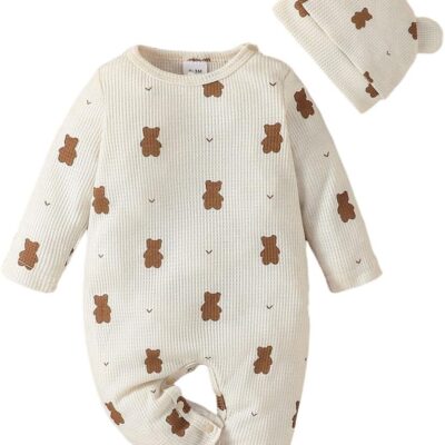 Baby Boy Romper Cute Bear Print + Bear Hat for Infant Baby Boy Outfit Set