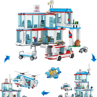 QLT 3 in 1 City Hospital Building Block Set, Hospital Rescue Helicopter, Trailer and Stretcher, STEM Gift for Boys and Girls Aged 6-12+(687PCS)