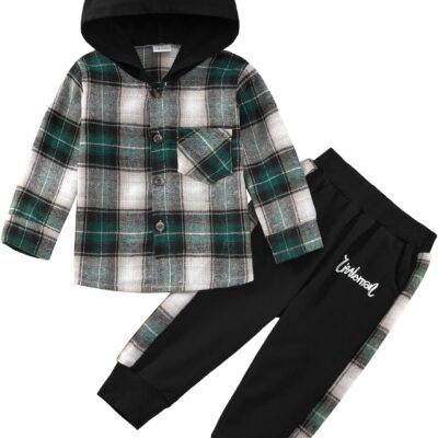Naiyafly Toddler Boys Clothes Set Kids Long Sleeve Hoodie Plaid Sweatshirt Tops + Pants Outfit Set Children Hooded Button Down Shirts Bottom Tracksuit Boys School Playsuit