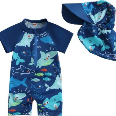 Baby Boy Swimming Costume Toddler Boy Swimsuit Infant Bathing Suit Short Sleeve One Piece Rash Guard Sun Hat Summer Beachwear