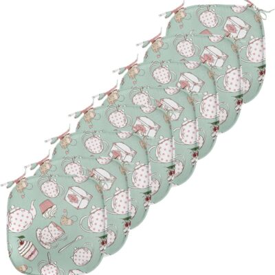 Ambesonne Tea Party Chair Seating Cushion Set of 8, Polka Dots on Teapots and Cups Cupcake with Cherry on Top Teabag English, Anti-Slip Seat Padding for Kitchen & Patio, 16″x16″, Almond Green Coral
