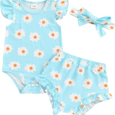 Newborn Baby Girl Clothes Floral Print Fly Sleeve Romper Ruffle Bloomer Shorts Headband Set 3Pcs Summer Outfits (B-Blue A, 3-6 Months)