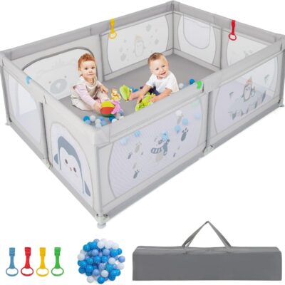 GYMAX Baby Playpen, 206 x 147cm Large Toddler Fence Play Yard with 50 Ocean Balls, Suction Cups, Zipper Door and Carry Bag, Indoor Outdoor Infant Activity Center (Grey with Penguin Pattern)
