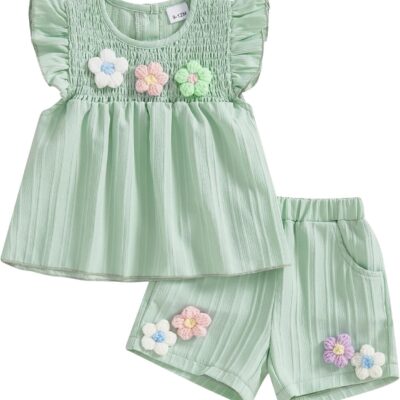 Baby Girl Summer Clothes 3D Flower Embroidery Smocked Tunic Top Casual Shorts Set 2Pcs Toddler Summer Outfit 9M-4Y