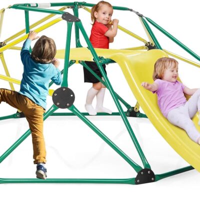 GYMAX Dome Climber with Slide, 2 in 1 Kids Climbing Set, Convenient Grip, Outdoor Indoor Children Climbing Frame for 3-12 Years Old Boys Girls (Green+Yellow)