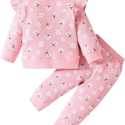 JiAmy Toddler Baby Girls Clothes 2PCS, Infant Clothing Sets – Love Printed Pullover and Trousers Long Sleeve Ruffle Sweatshirt Top Long Pants Outfits Set, 0-24 Months