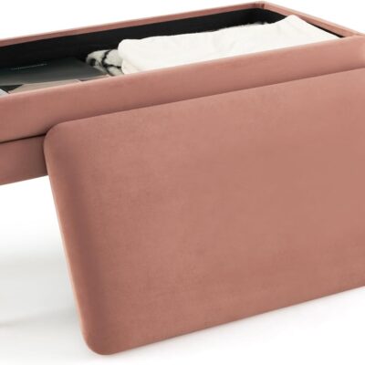 COSTWAY Storage Ottoman with Removable Top, Velvet Upholstered Storage Bench with Compartment & Gold Metal Legs, Modern Rectangular Footstool for Bedroom Living Room (Pink)