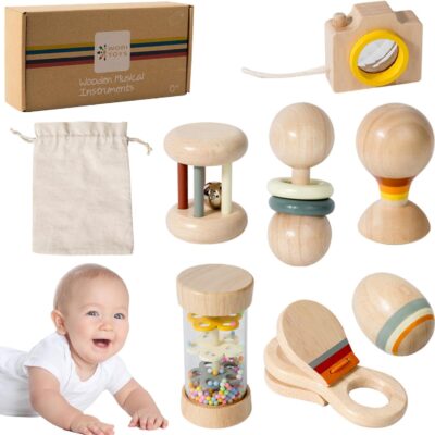Baby Rattle 7Pcs/Set Wooden Baby Rattle Organic Natural Baby Rattle With Rainstick, Hand Bell, Sand Ball,Montessori Wooden Rattle For Boys & Girls Birthday,Rattle Toys For Babies 0-6 Months