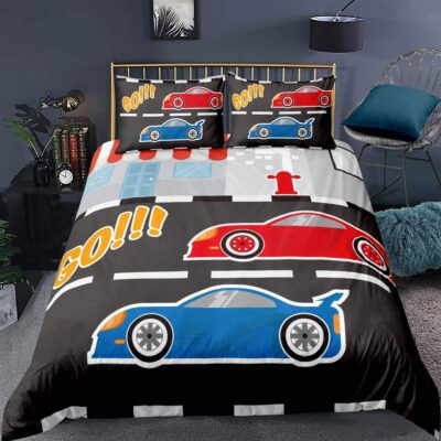 Loussiesd Vehicle Bedding Set For Kids Child Boys,Car Traffic Sports Racing Nursery Theme Design Print,Decorative 3 Pieces Comforter Cover Double Size (1 Duvet Cover Set & 2 Pillow Shams),Zipper