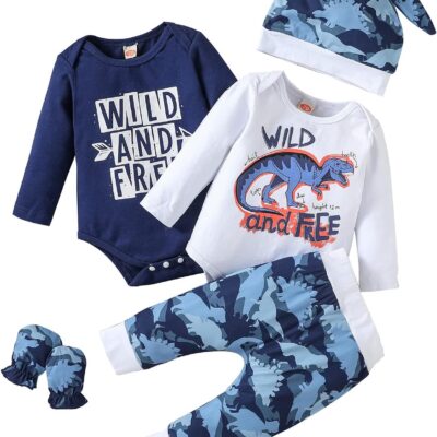 Haokaini Newborn Baby Boys Dinosaur Outfits Long Sleeve Letter Printed Romper Bodysuit Pants 5PCS Outfits Set