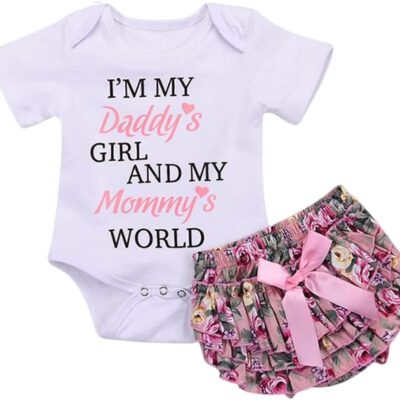 Baby Girl Clothing Set, Infants Short Sleeve Daddy’s Girl and Mommy’s World Romper + Flowers Ruffled Bloomer Shorts Outfits for 0-18Months