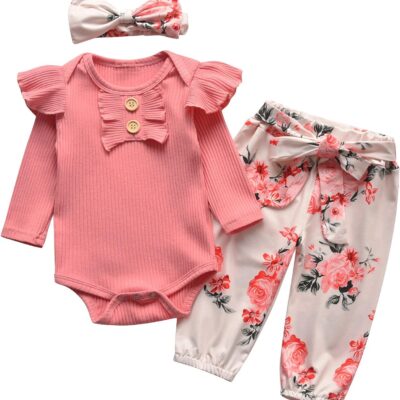 Tinykeke Newborn Baby Girl Clothes Sets Infant Long Sleeve Romper Ruffle Tops & Floral Printed Trouser and Headband 3 Pieces Outfits Sets