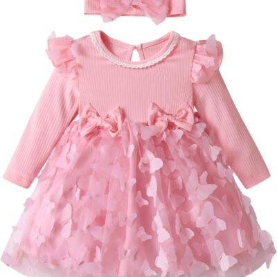Kumsolu Toddler Baby Girl Clothes Dress Mesh Tulle Butterfly Print Long Sleeve Dresses