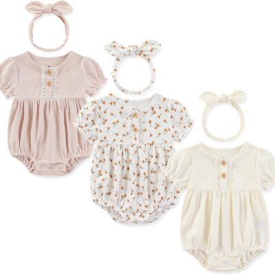 Ecojoy Baby Girl Vest 3PCs Grow Long/Short Sleeve Summer Fall Bodysuit with 3 Headbands/Hats