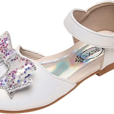 Baby Girls Dress Dance Shoes Bow Glitter Sequins Ankle 𝗟ow Heel Sandals Closed Toe Strap Toddler Kids Loafers (White, 11.5 Little Child)