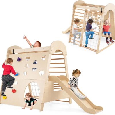 COSTWAY Kids Climbing Frame, 8 in 1 Wooden Jungle Gym with Climbing Rock/Net, Ladder, Slide, Swing, Monkey Bars, Indoor Montessori Climber Playset for 3+ Years Old (Natural)